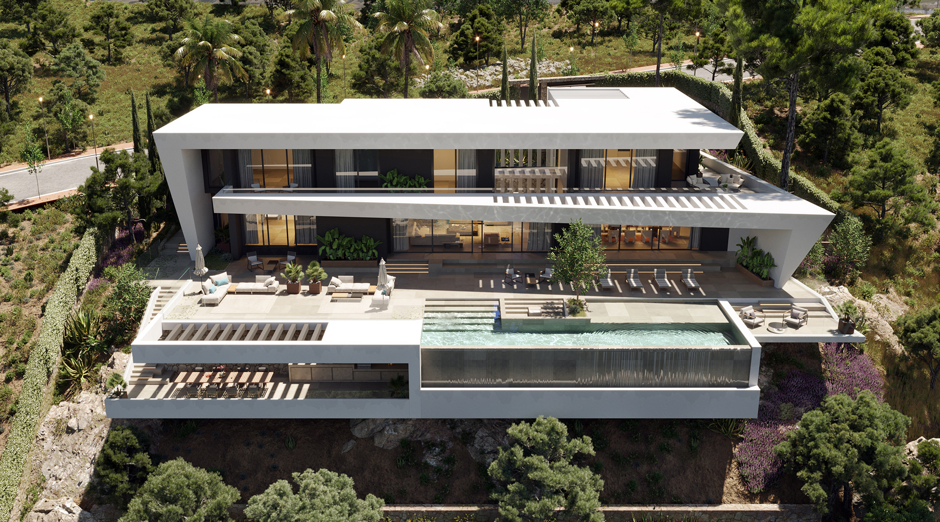 La villa se abre hacia amplias terrazas que acompañan la vivienda en distintos niveles, ofreciendo diferentes escenarios para disfrutar del sol, la tranquilidad y la privacidad. La distribución ha sido pensada para crear una experiencia residencial sofisticada, con espacios diáfanos, luz envolvente y una sensación continua de amplitud.